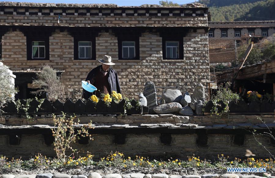 A villager waters flowers in Ranyang Village of Daocheng County, southwest China's Sichuan Province, Nov. 7, 2017. There are 186 people of 33 households living in the Tibetan village. Luzhou City of Sichuan provided counterpart assistance to Ranyang Village since September of 2016 in poverty alleviation work. Villagers witnessed great changes at the typical and traditional Tibetan village after construction of more than one year. (Xinhua/Jiang Hongjing)