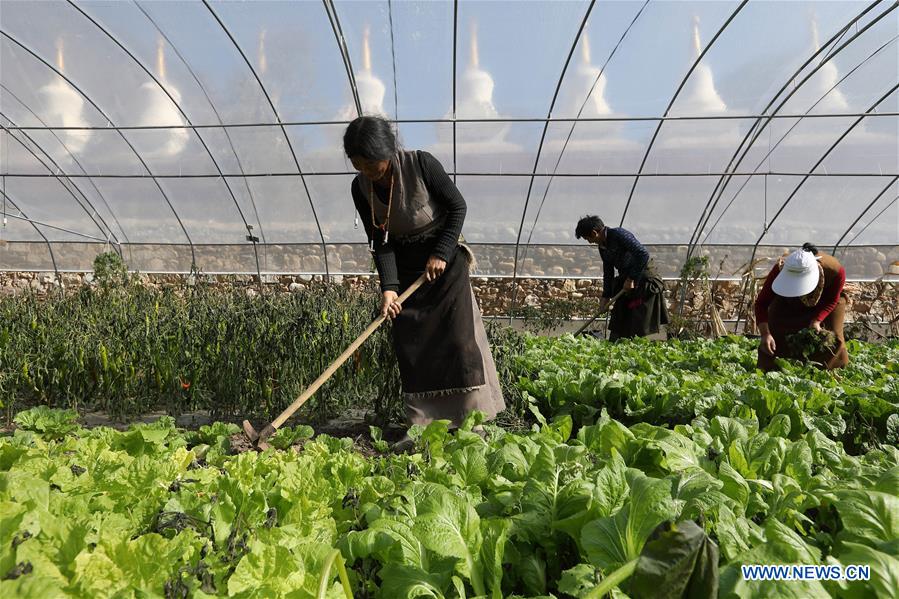 Villagers work in a greenhouse in Ranyang Village of Daocheng County, southwest China's Sichuan Province, Nov. 7, 2017. There are 186 people of 33 households living in the Tibetan village. Luzhou City of Sichuan provided counterpart assistance to Ranyang Village since September of 2016 in poverty alleviation work. Villagers witnessed great changes at the typical and traditional Tibetan village after construction of more than one year. (Xinhua/Jiang Hongjing)