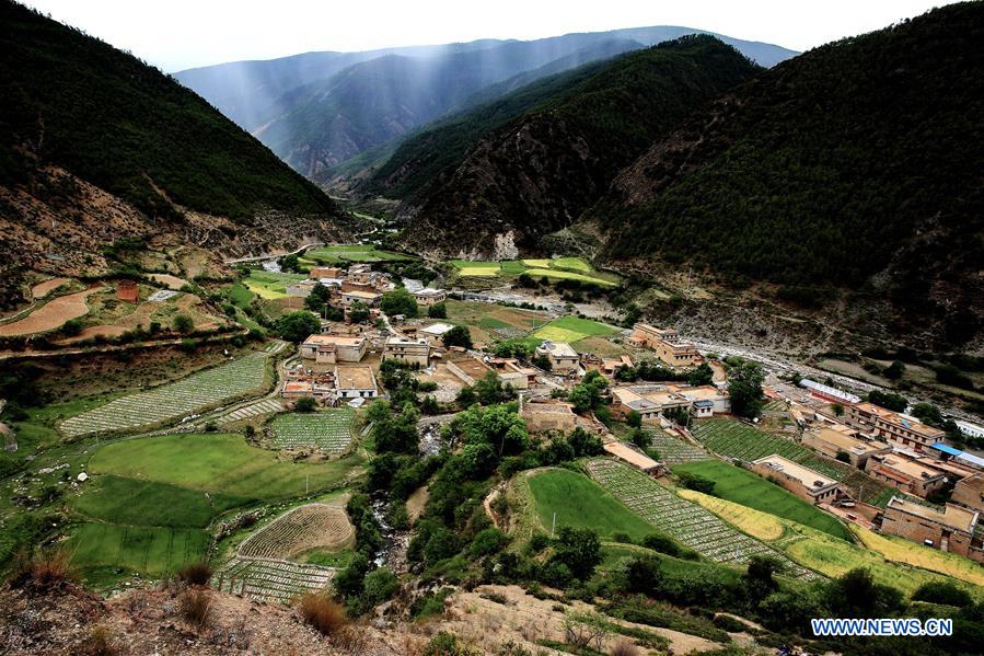 Photo taken on May 27, 2017 shows Ranyang Village in Daocheng County of southwest China's Sichuan Province. There are 186 people of 33 households living in the Tibetan village. Luzhou City of Sichuan provided counterpart assistance to Ranyang Village since September of 2016 in poverty alleviation work. Villagers witnessed great changes at the typical and traditional Tibetan village after construction of more than one year. (Xinhua/Jiang Hongjing)