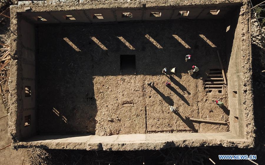 Villagers build their house in Ranyang Village of Daocheng County, southwest China's Sichuan Province, Nov. 7, 2017. There are 186 people of 33 households living in the Tibetan village. Luzhou City of Sichuan provided counterpart assistance to Ranyang Village since September of 2016 in poverty alleviation work. Villagers witnessed great changes at the typical and traditional Tibetan village after construction of more than one year. (Xinhua/Jiang Hongjing)