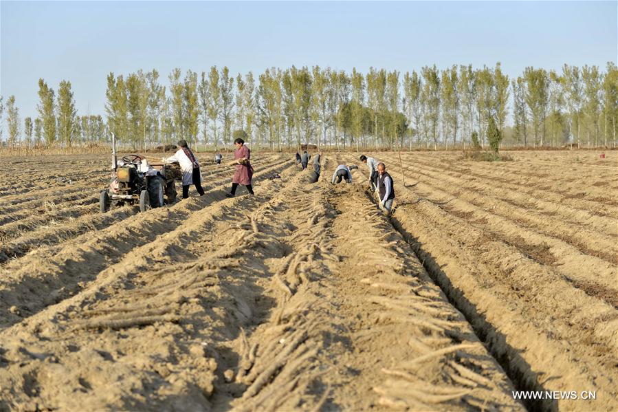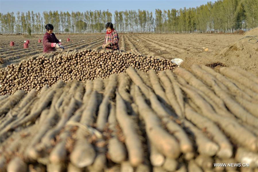 Famers harvest Chinese yam in Renxian County, north China's Hebei Province, Nov. 20, 2017. More than 200 hectares of Chinese yam planeted in Renxian County came into harvest season recently. (Xinhua/Mou Yu)