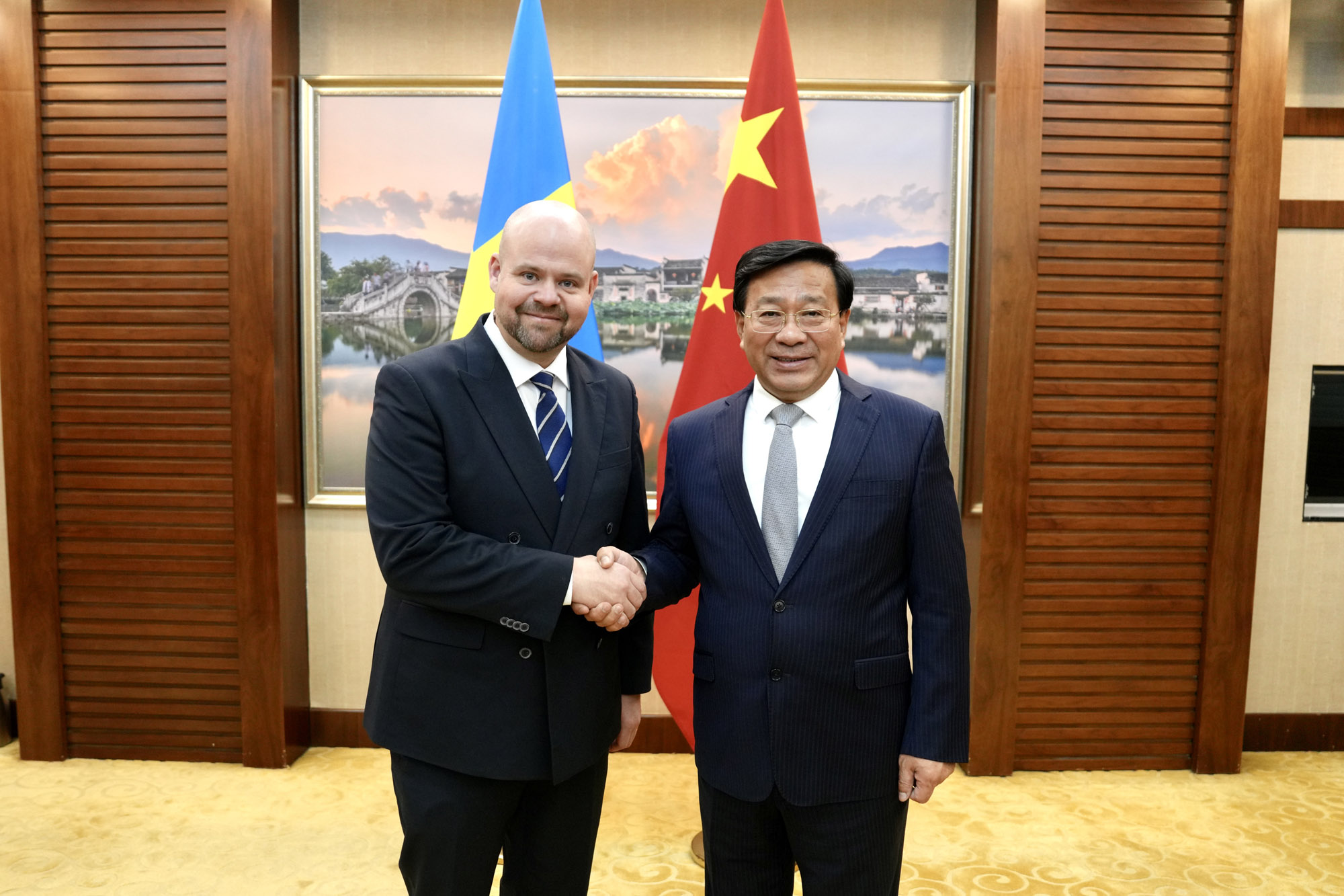 Han Jun, Minister of Agriculture and Rural Affairs, met with Peter Kullgren, Minister for Rural Affairs of Sweden, in Beijing on November 7. They exchanged views on advancing practical cooperation in agriculture and rural affairs between China and Sweden.